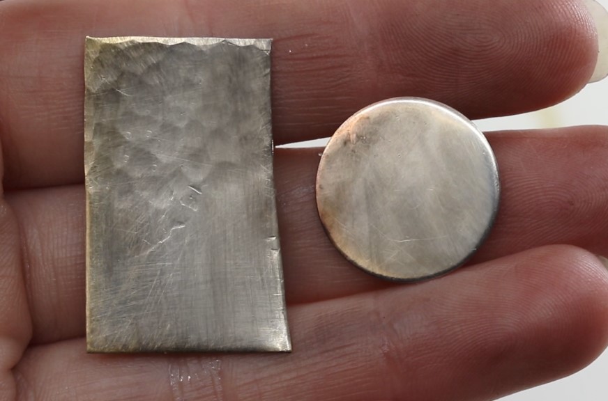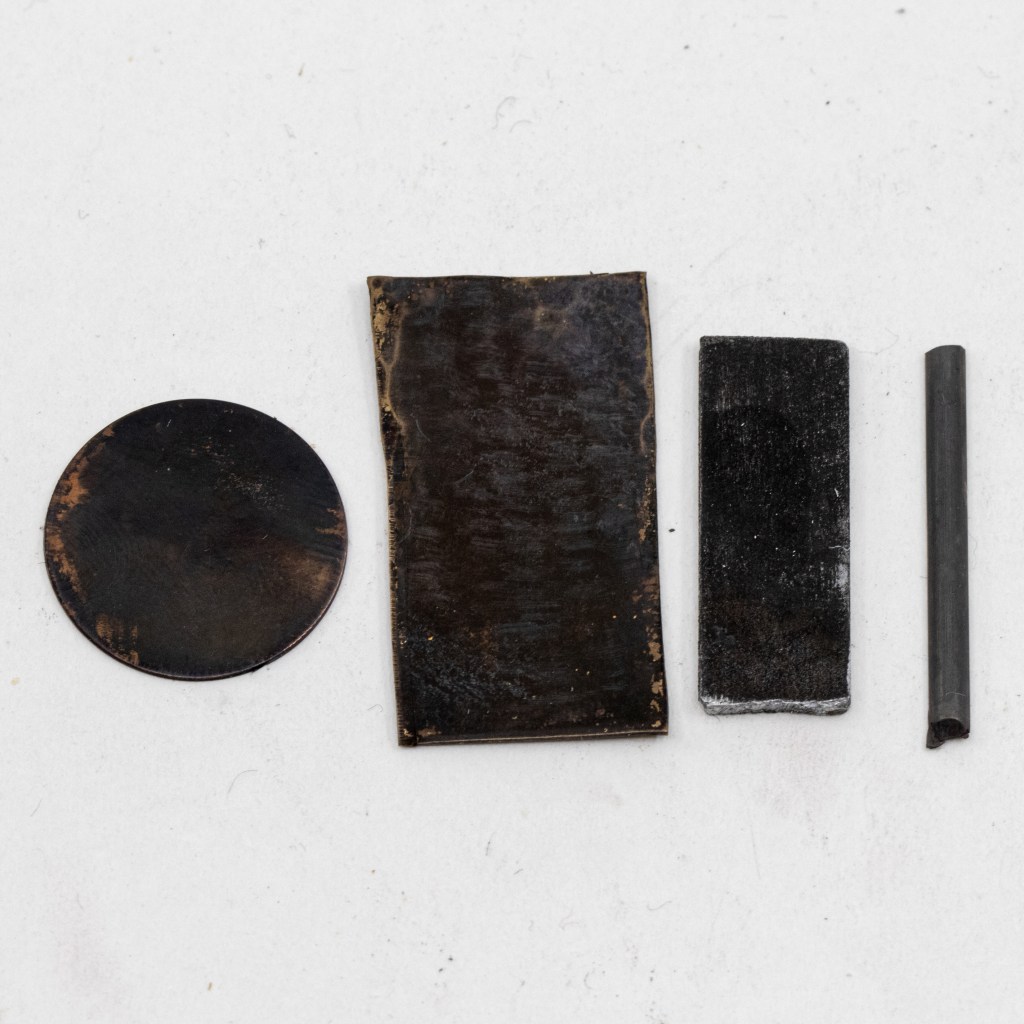 Several JAX patinas are formulated to make a black finish on different metals. They have these blackening solutions for silver, gold, copper, bronze, brass, aluminum, iron, steel, nickel, and pewter. These vary in their exact composition and effect, as you may have seen in our video. The below photo demonstrates the difference in results on a few different metals.