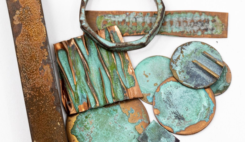 Some other, more complicated finishes that are often achieved with patinas are states of decomposition of metals. Effects like rust on iron and steel, or verdigris on copper and brass would be examples of this. One finish that JAX is particularly famous for is the JAX Green patina. This chemical is used to produce an authentic and consistent verdigris on copper and brass. The green patina is commonly used in sculptural and architectural situations, but also makes a beautiful finish on jewelry. JAX also makes a patina called Antique Rust which is great for creating rust on iron and steel. It is often used in hardware and sculpture.
